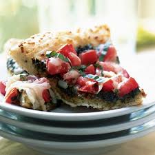 mozzarella pesto mushroom pizza with extra thick, soft doughy crust.